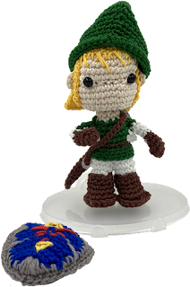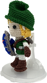 Link et princesse Zelda réalisés au crochet et remplis de fibres polyester. Link a bien sûr son épée dans son fourreau, son bonnet et son écu.